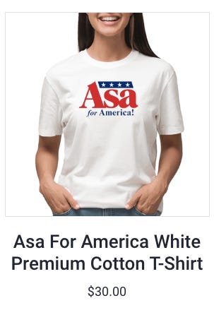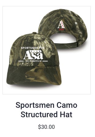 The former Arkansas governor’s simple slogan, splayed on T-shirts, golf balls, membership cards, buttons, bumper stickers, beverage coolers, tote bags, and “White Mesh Trucker” hats, is “Asa for America.” This provides some pleasing alliteration; helps clarify that this is his name, not “Ada,” as Trump likes to call him; and justifies the campaign’s relentless use of the colors red, white, and blue. The only available merch that leaves these colors in the lurch is Hutchinson’s “Sportsmen Camo Structured Hat,” which is camo-patterned as well as gender exclusive, at least in name. Eight of the 18 featured products on Hutchinson’s site have the word “white” in their names. Prices range from $12 to $48.