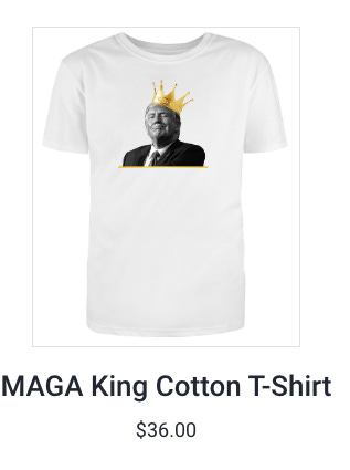 The former president and undisputed King of Merch enters his third campaign with nearly 100 featured products—shirts, caps, bumper stickers, signs, mugs, buttons, beverage coolers, and stickers. The messages include “America’s Favorite President,” “Trump Was Right About Everything,” “I Stand With Trump,” and “Trump Country”; that last message can be customized to appear over an outline of specific states like Iowa and Nevada. There’s one T-shirt that pictures Biden standing at a podium with a banner that says “Nation In Decline.” Only a few items include Trump’s own image, including one T-shirt where he is shown wearing a crown and being proclaimed the “MAGA King,” and another that puts a fake mugshot over the words “Not Guilty.” That’s only true if the crime is good taste.