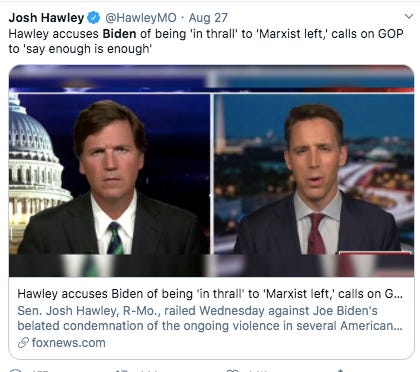 Appearing on Tucker Carlson’s show, Hawley was asked about Biden’s appointment of Janet Yellen to be his treasury secretary. He reiterated his concerns about Biden appointing so many “corporate liberals and warmongers.”
