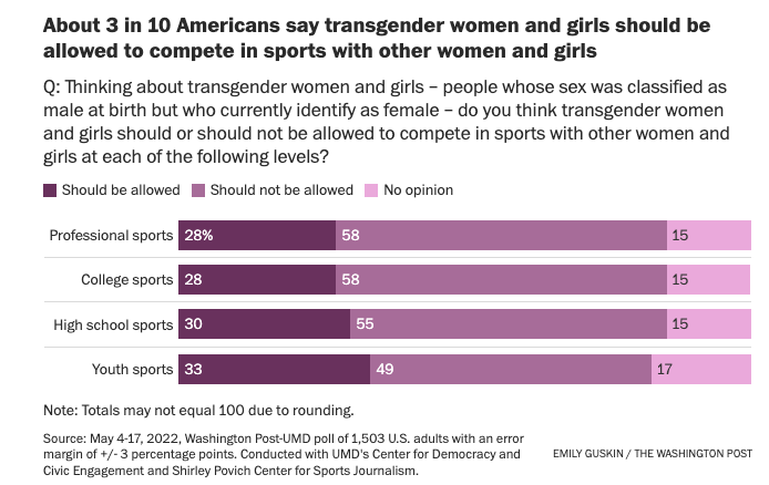 (In case you missed it, I wrote last week about the controversy over trans athletes in women’s and girls’ sports and reported similar results from an earlier Gallup poll.)