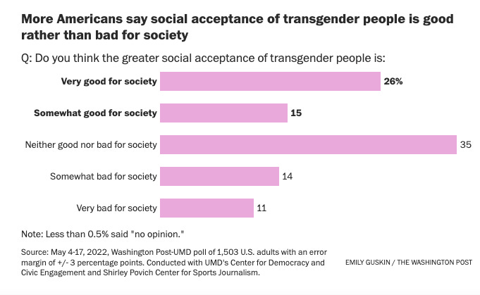 That may well be the case. I don’t think most Americans would sympathize with the Texas GOP platform’s militant rejection of any acceptance of transgender identities. In a Washington Post/University of Maryland poll released last week, more American adults said they believe increased acceptance of transgender people is good rather than bad for society—by 41 to 25 percentage points: