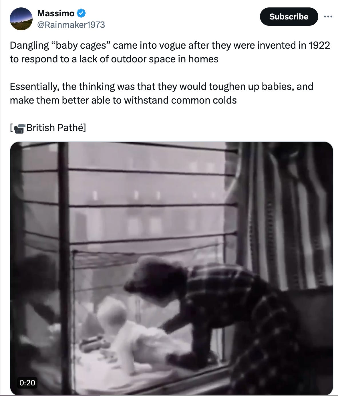 I wrote about baby cages a decade ago when demographics was my beat. I won’t recapitulate the entire spiel for you here—you can get the book if you like—but for the purposes of today’s discussion the take-aways are: