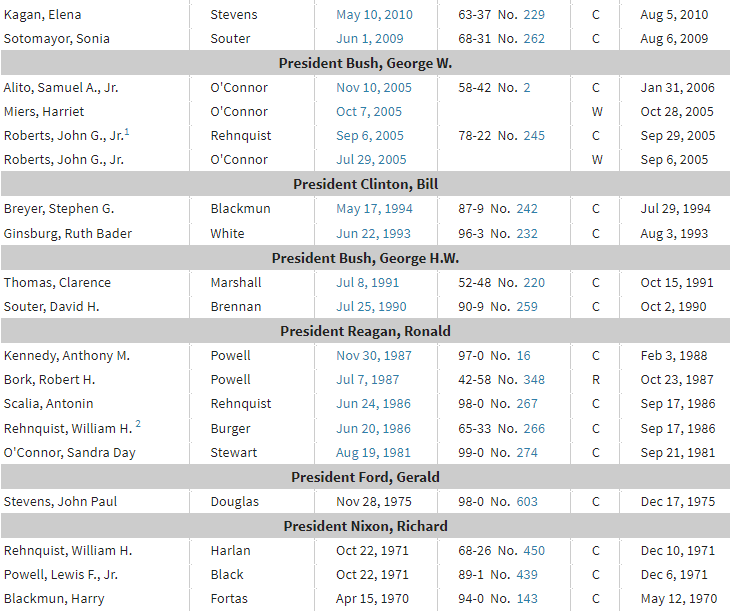 Some nominations were more contentious. Clarence Thomas received only 52 votes; and Robert Bork was actually rejected on a 42-58 vote.