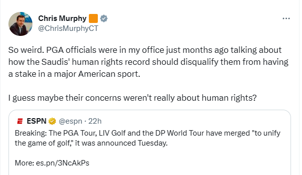 And, of course, Trump bleated out: “GREAT NEWS FROM LIV GOLF. A BIG, BEAUTIFUL, AND GLAMOROUS DEAL FOR THE WONDERFUL WORLD OF GOLF. CONGRATS TO ALL!!!”