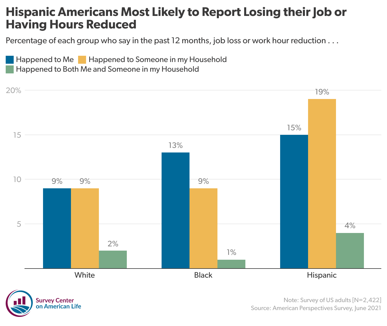 The stay-at-home orders and layoffs took a larger toll on Hispanic workers and families. Forty-four percent of Hispanics said either they or someone in their household lost their job or had hours reduced, compared to 24 percent of blacks and 22 percent of whites. To make ends meet, Hispanics dipped into their retirement accounts during the pandemic to pay their bills at a significantly higher rate, 24 percent, than either blacks (20 percent) and whites (18 percent). Hispanics were more likely than whites or blacks to have worked part-time and minimum-wage jobs or in positions where tips were the main source of compensation. Hispanics also reported greater economic distress on measures like “lack of money” and “cost of living,” with almost one-third citing housing and living costs as the most important problems facing their household.