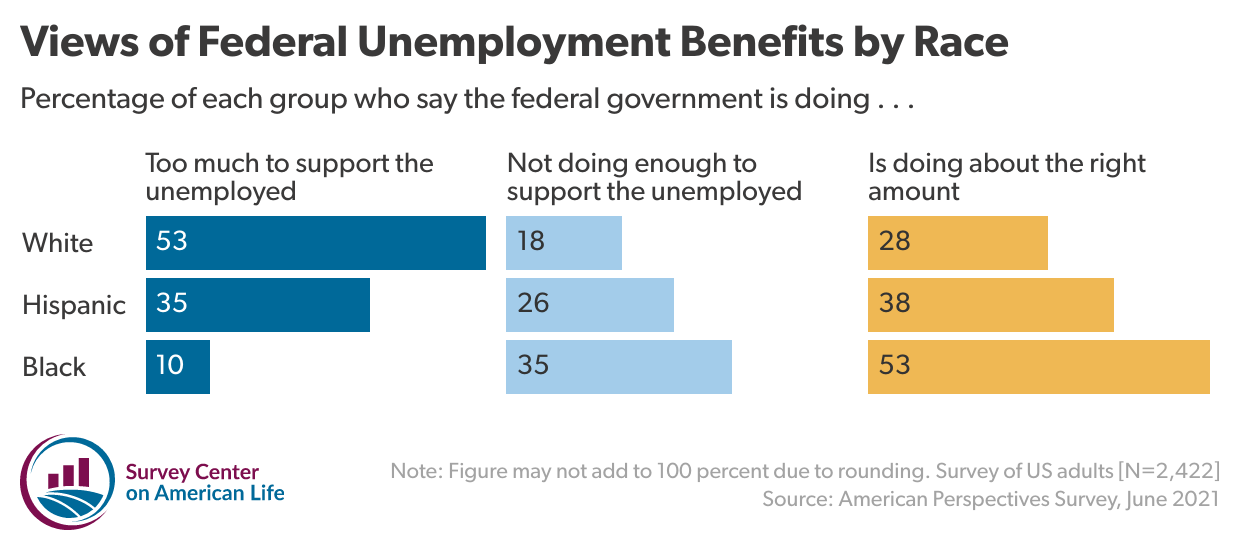 Together, these numbers paint a portrait of a Hispanic population that places a high value on work, is seeking new skills aggressively, and does not want to spend time out of the workforce. Hispanics are also somewhat suspicious of what they see as overly generous unemployment insurance (UI) benefits. While not as critical as whites, Hispanics were three times more likely than blacks (35 vs. 10 percent) to say the government was doing too much to help the unemployed during the pandemic. Thirty-three percent of Hispanics said the UI benefits were too generous, compared to 13 percent of blacks. (Forty-six percent of whites agreed the UI benefits were excessive.)