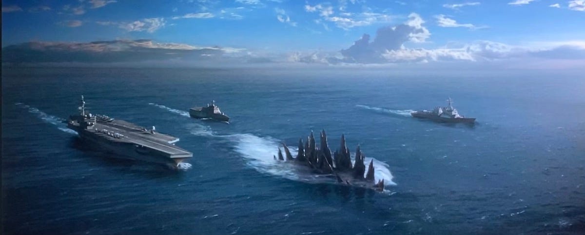 The thing I love most about the movie, however, is the shot that serves as the image for this item. There’s something quite endearing about the fact that the filmmakers took a walking, fire-breathing symbol of nuclear arrogance—a Japanese warning against the horrors of Hiroshima and Nagasaki—and turned him into what amounts to an adjunct of the United States military. Just look at that picture! Godzilla is basically part of the American Navy. You love to see it!