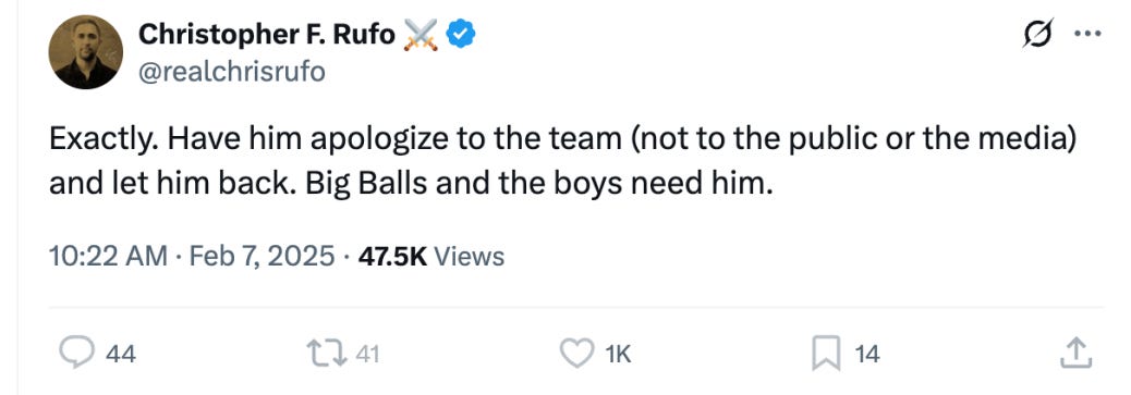 But here’s the thing: Calling out Rufo on such hypocrisy has no effect. It bounces right off him. He’s quite open about wanting to help his friends and hurt his enemies. Principles are for the weak and ineffective.