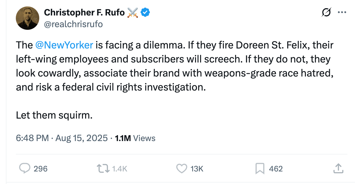 BESIDES HIS POSITION as the Trump administration’s court intellectual, Rufo also doubles as a leader of right-wing social media mobs practicing exactly the kind of “cancel culture” he and his allies have so energetically denounced on the left. Before the Cracker Barrel drama, there was the controversy over New Yorker writer Doreen St. Felix, who offended the right with a fairly anodyne essay analyzing the cultural politics of the American Eagle “Sydney Sweeney has great jeans” ad with its play on “genes/jeans” and its references to Sweeney’s blue eyes and blond hair. While St. Felix’s detractors claimed that she referred to Sweeney as an “Aryan princess,” what she actually wrote—as even the screenshot shared by Rufo showed—was that Sweeney had a legion of adoring fans “the most extreme of whom want to recruit her as an Aryan princess.” The entire point of St. Felix’s piece was that the controversy was meaningless: Some negative voices on the left followed by a splash of right-wing outrage.