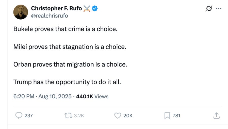 Leaving aside Argentina’s libertarian president Javier Milei, who shares the Trumpian predilection for norm-breaking but is also in many ways the opposite of MAGA populism, two of the three leaders Rufo admiringly cites are corrupt authoritarians. The Orbán regime’s anti-migrant stance has included a crackdown on nonprofit groups that aid refugees or support immigration. The shocking human rights abuses on which Bukele’s anti-crime drive is founded have recently been in the spotlight because of the lawless deportations of Venezuelan migrants from the United States to El Salvador’s notorious CECOT megaprison. Bukele has also recently scrapped presidential term limits, with a view to becoming president for life.