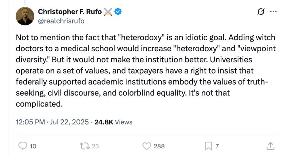 Viewpoint diversity would entail “adding witch doctors to a medical school”? Whatever you say, Chris. (Also: Before you go mocking witch doctors, you should check out the top medical official appointed by the president you cheerlead for, or the surgeon general appointed by the Florida governor who has you on his team.) It’s no less absurd to suggest that viewpoint diversity is somehow at odds with “truth-seeking” and commitment to civil discourse or equality. (The Heterodox Academy “reform agenda” includes “knowledge-seeking,” open inquiry, and disagreement and debate as core academic skills.) It’s almost as if Rufo’s beef with viewpoint diversity as a goal of academic reform was actually about something else. Something, perhaps, like the kind of conservative agenda he praises the Orbán regime for promoting in its coercive reform of cultural institutions—intended, according to his 2024 piece, “to strengthen . . . family life, Christian faith, and historical memory.”