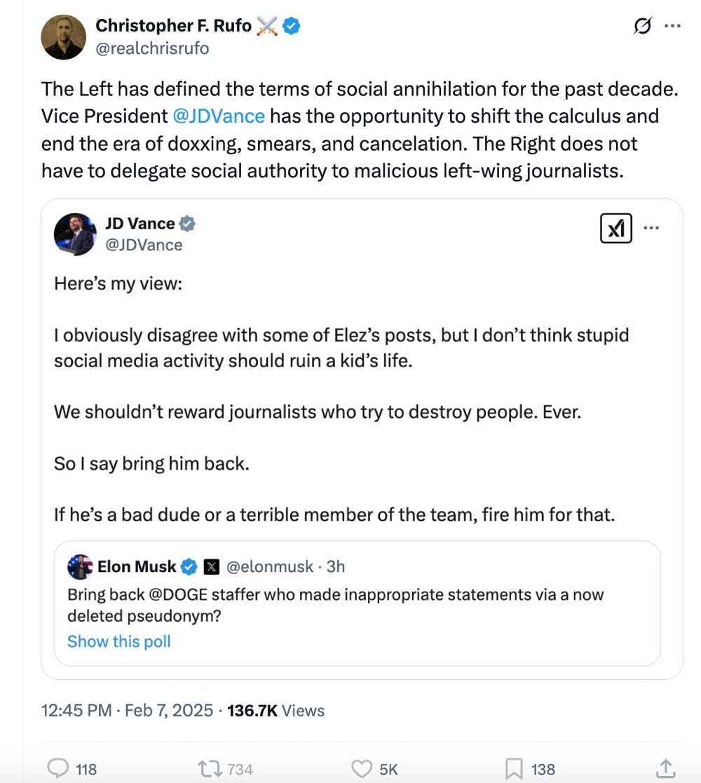 Yet it turns out that Rufo doesn’t have a problem with all race hatred. Remember when it was revealed that a member of Elon Musk’s DOGE team, Marko Elez—previously a SpaceX employee—had posted a string of inflammatory tweets like “Just for the record, I was racist before it was cool,” “You could not pay me to marry outside of my ethnicity” and “Normalize Indian hate”? Those comments were made in the summer and fall of 2024—three to seven months, not ten to eleven years, before they were uncovered. Elez resigned after the Wall Street Journal reported the posts—but quickly found support in the MAGA camp. Vice President JD Vance stepped in to defend him on the very same day. Tech entrepreneur Balaji Srinivasan explained that “giving a single inch to a journo” was unacceptable and that “the entire practice of digging through people’s old posts to find some negative remark should be deprecated.”