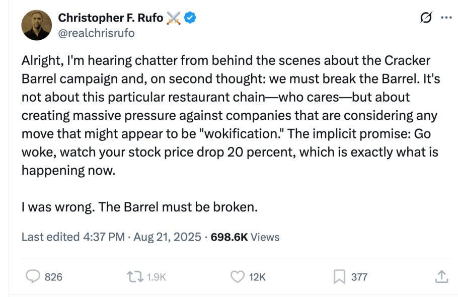 LAST WEEK’S RIGHT-WING FREAKOUT over the Cracker Barrel logo redesign—apparently amounting to white-guy erasure—had more than its share of sublimely ridiculous moments. But none, perhaps, were more emblematic of the current “anti-woke” crusade than the call to action from author, activist, and Manhattan Institute fellow Chris Rufo.