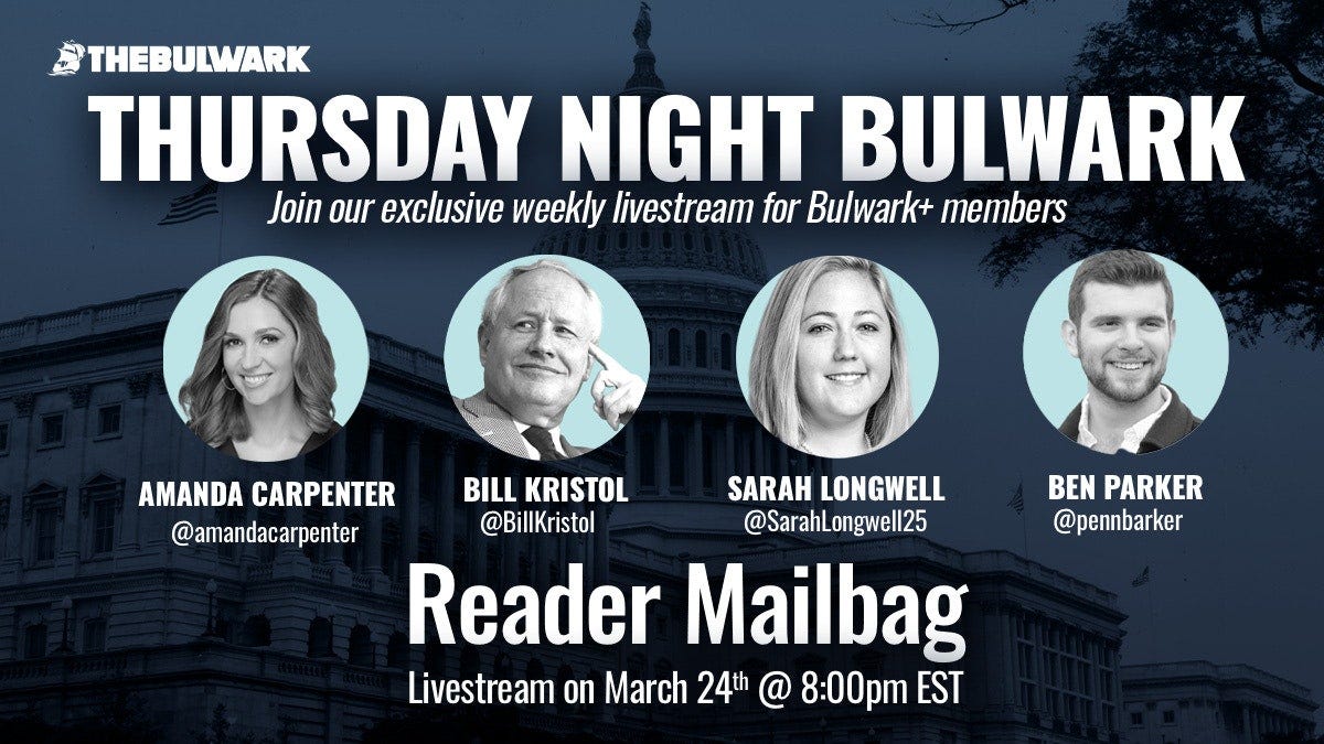 That’s it for me. Tech support questions? Email members@thebulwark.com. Questions for me? Respond to this message.