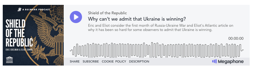 Eric and Eliot consider the first month of Russia-Ukraine War and Eliot’s Atlantic article on why it has been so hard for some observers to admit that Ukraine is winning. They also talk about how the Russian military’s failures to achieve its objectives might lead to stalemate, and how we should think about the risks of escalation and what is a theory of victory.