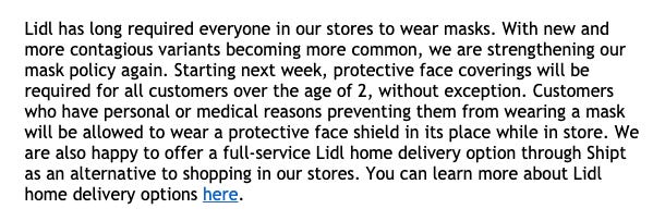But Lidl, my favorite grocer, is strengthening their mask policy: