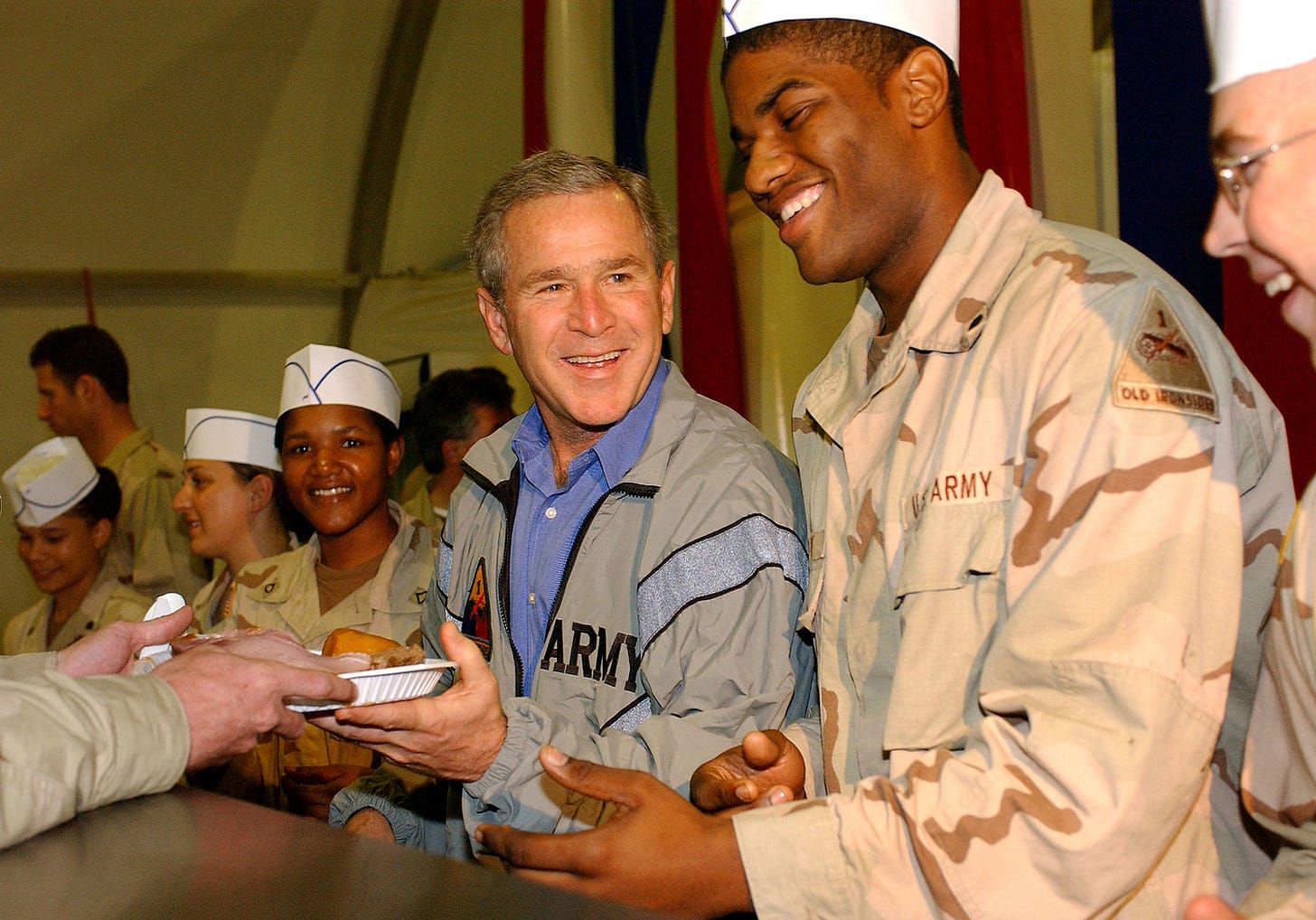 One came in 2003 when I was serving with the 1st Armored Division in Iraq. President George W. Bush made an unannounced Thanksgiving visit to Baghdad that year that only a handful of people knew about. Air Force One flew in without lights. The secrecy was tight because the risk was real. The moment he walked into a massive dining facility, packed wall-to-wall with hundreds of stunned American troops who had no idea he was coming, the room erupted. For hours he stayed—serving turkey, shaking hands, posing for photos, later talking strategy with just the commanders. He wore an Army PT jacket with a 1st Armored Division patch sewn on the front, a simple gesture that spoke volumes to the troops who were wearing that same patch in combat.