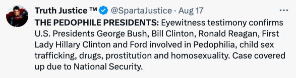 HERE ARE SOME POSTS I happened upon last week from an account calling itself Truth Justice™ on the social media platform formerly known as Twitter: