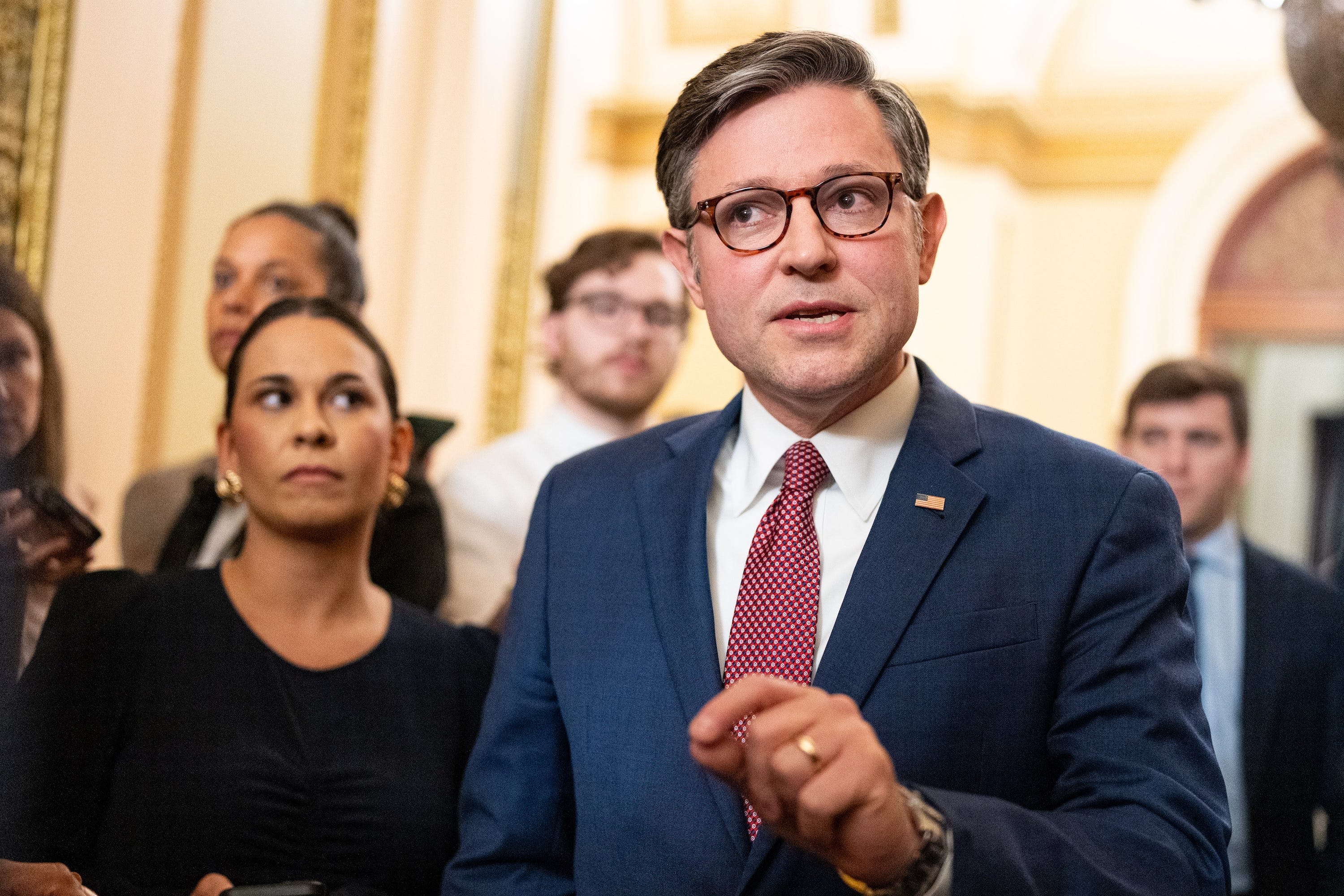 Speaker of the House Mike Johnson (R-La.) stops outside the House chamber to speak to reporters in the Capitol on May 15, 2025. (Bill Clark/CQ-Roll Call, Inc via Getty Images)