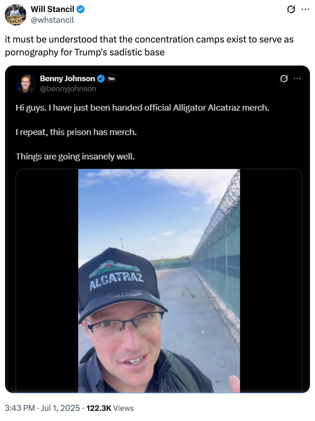 We need to quit using the terms "detention center" and "Alligator Alcatraz". These creeps are masters at misusing language. Let's use "concentration camp" or "Alligator Auschwitz" at every opportunity.