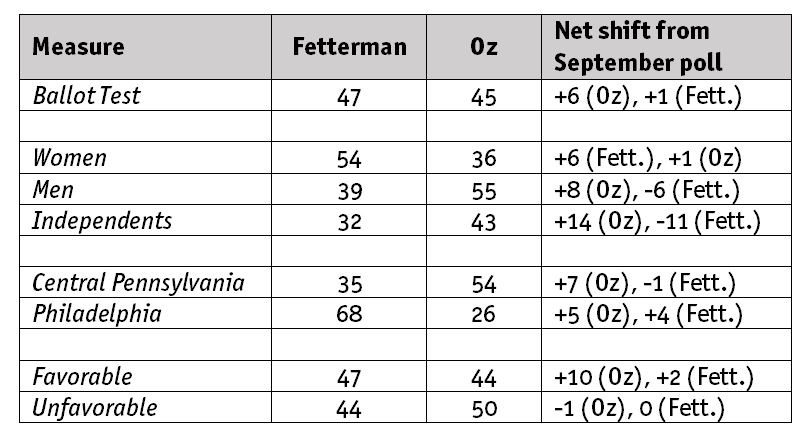 The Pennsylvania Senate race between Democrat John Fetterman and Republican Mehmet Oz is as tight as can be, but Oz has clear momentum. The middle columns in the table below are drawn from the USA Today/Suffolk University conducted Oct. 27-30—entirely after the candidates’ debate last week. The column on the right shows how far each category has shifted since the previous iteration of the same poll, conducted Sep. 27-30.