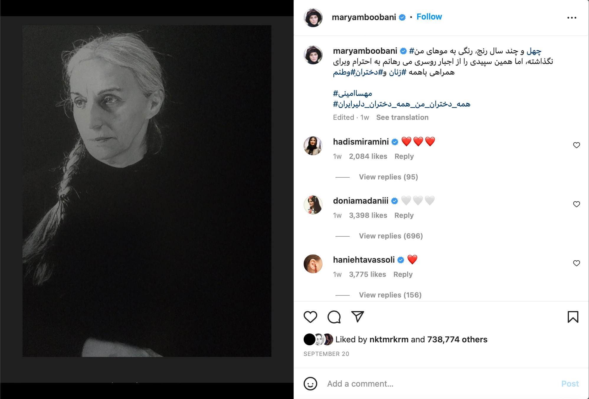 Fellow actress Maryam Boobani posted a picture of herself without hijab, her silver hair free, with a caption that began, “40 and something years of pain has whitened my hair”:
