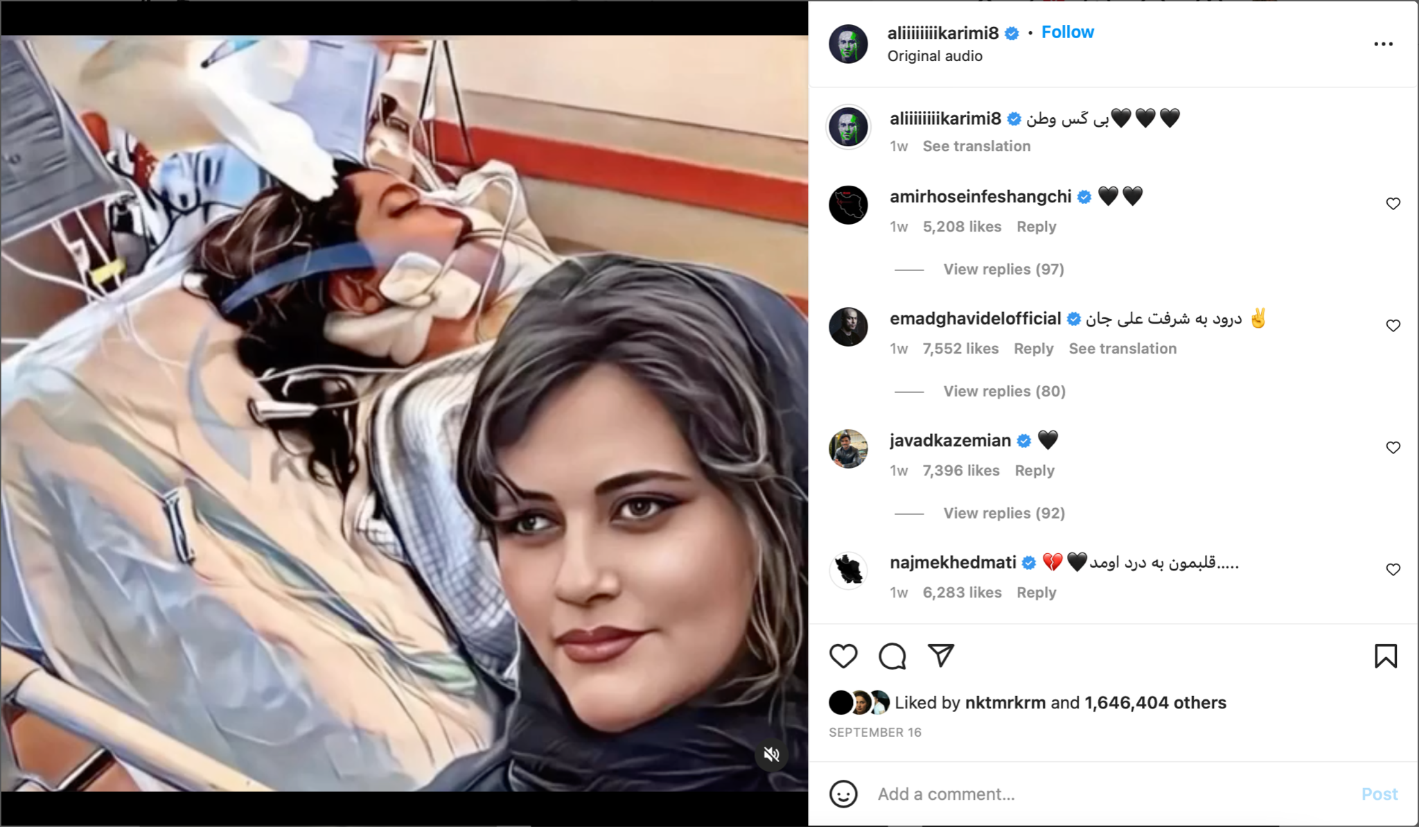 Oscar winner Asghar Farhadi has urged international solidarity with protesters. Although the regime has in the past blacklisted stars for adverse political speech and prevented them from continuing to work in the country’s entertainment industry—like soccer, one of the few remaining places in Iran where it is possible to make real money without working directly for the regime—other filmmakers and actors have shared similar sentiments. Amir Jafari, a nationally beloved comic actor, posted on Instagram an uncharacteristically dark message: