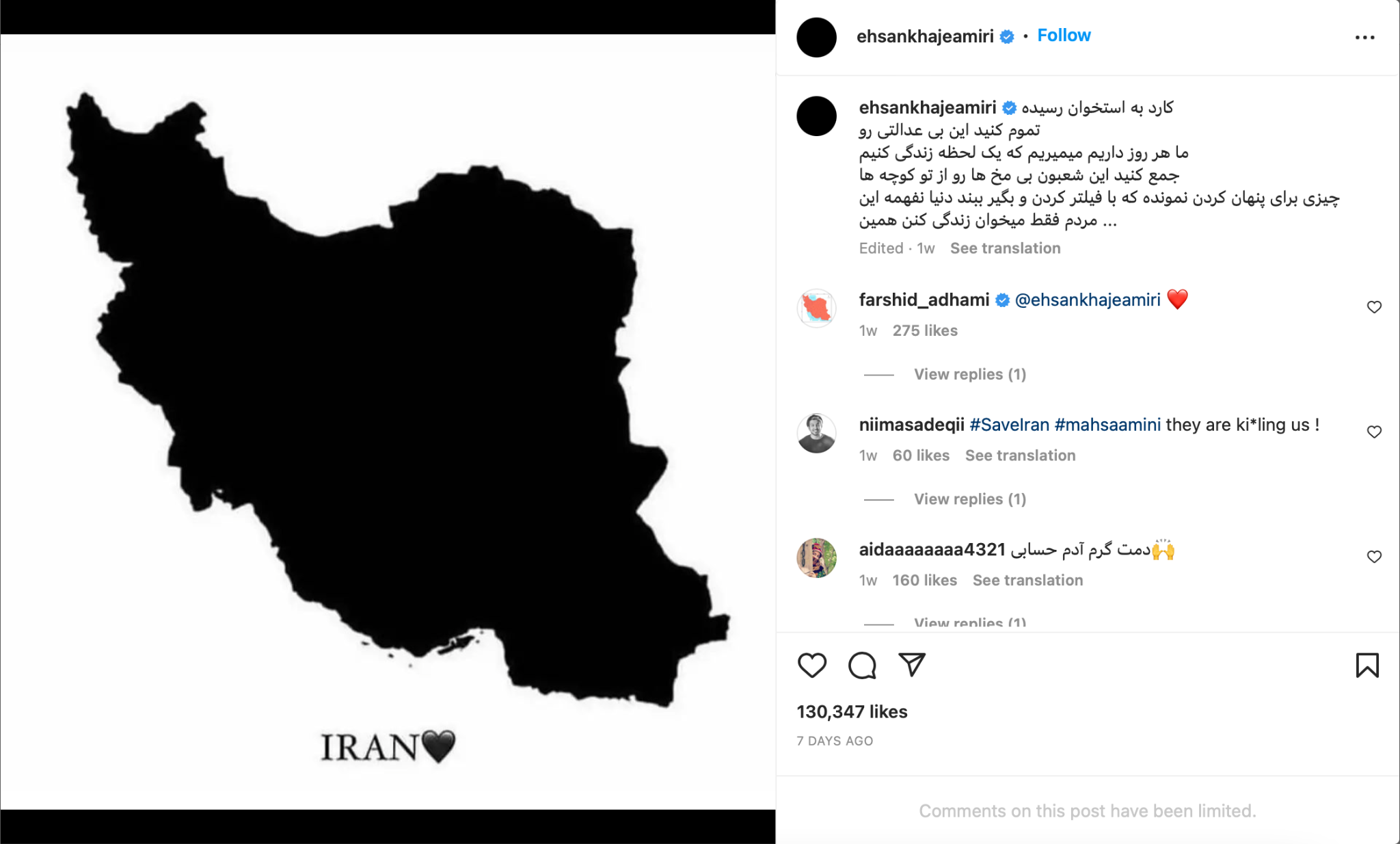 Today and all these years, wherever I spoke from Khuzestan to Kurdistan [both minority-majority provinces] and everywhere in this homeland it has been out of love for these people—full stop. These very people who are being beaten up cowardly and innocently.” He continued, “I, Mohsen Chavoshi, in full mental and physical health, announce that I end all my work with the Ministry of Guidance [Iran’s culture/censorship ministry], etc. for work permits and like always will sing for people's will and love. Silence is no longer permitted.