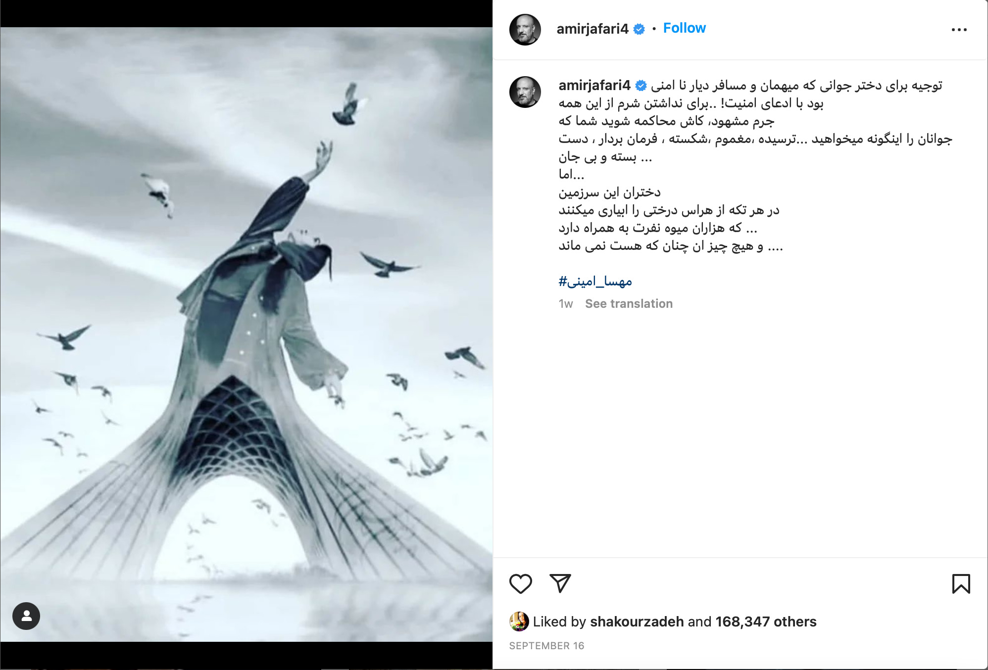 Amir Jafari: “For not having shame for all these crimes, I hope you . . . stand trials, you who want the youth like this, afraid, grieved, broken, obedient, with their hands tied, and lifeless. But the daughters of this country in every part will water a tree by fear that bears the fruit of hate, and nothing stays the way it is now.”