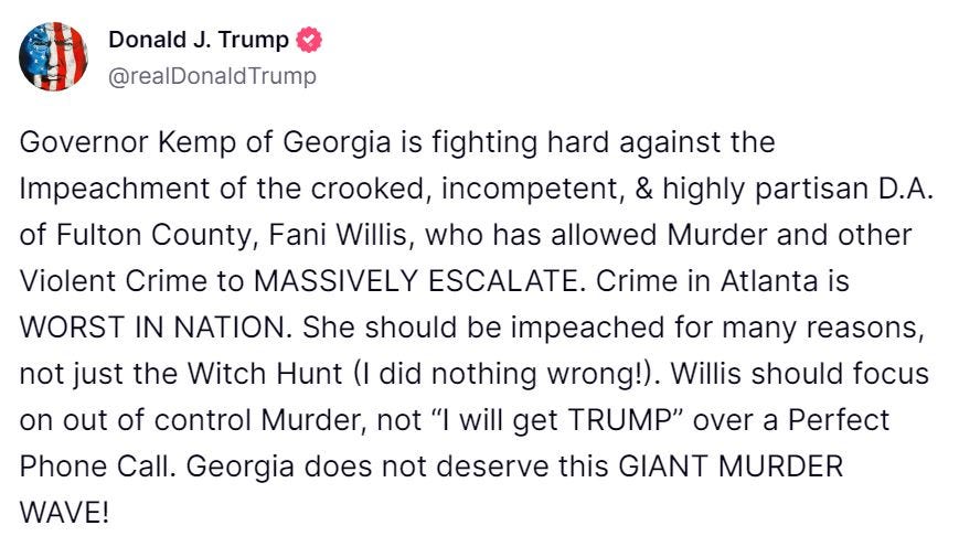 LET’S START WITH Kemp’s growing willingness to separate himself from Trump. The former president had attacked Kemp on social media over his resistance to Trump: “Governor Kemp of Georgia is fighting hard against the impeachment” of Fani Willis: