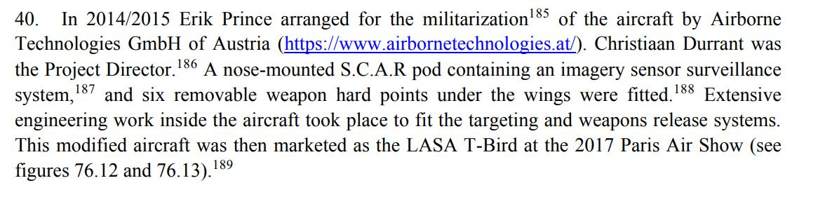 The charges overlap 2021 United Nations allegations that Prince had in 2019 violated the U.N. arms embargo on Libya in an aborted operation called Project Opus, financed by the United Arab Emirates to the tune of $80 million in support of Field Marshal Khalifa Haftar, head of one of the two perpetually contesting governments in Libya. Project Opus concerned several modified aircraft—both helicopters and fixed-wing planes—including the two mentioned in the Austrian case, which were extensively militarized: