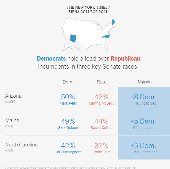 President Trump’s mismanagement of the coronavirus pandemic has imperiled both his own re-election and his party’s majority in the Senate, and Republican lawmakers in crucial states like Arizona, North Carolina and Maine have fallen behind their Democratic challengers amid broad disapproval of the president, according to a poll conducted by The New York Times and Siena College.