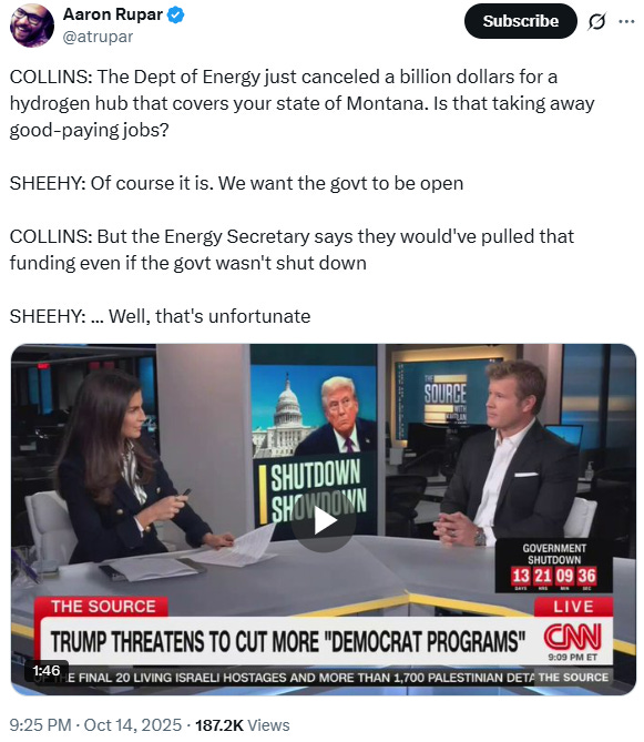 BLUE PAIN: Donald Trump’s targeting of Democratic areas for economic pain during the government shutdown hasn’t been exactly subtle. It’s exactly what they said they were going to do, after all. Still, this New York Times analysis showing the extent of the financial retribution is striking. Of the nearly $28 billion in grants the administration has frozen or canceled during the shutdown, $27.24 billion—97 percent—was for projects in Democrat-led congressional districts. The Times goes on: