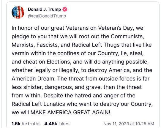 Trump amplified his message in his Veteran Day speech: Trump Promises to ‘Root Out’ the Left - The New York Times