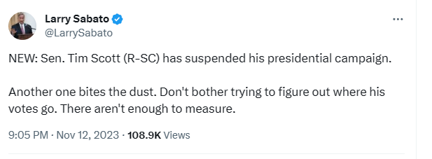 Because it’s Monday, let’s start with the bottom story of the day: Tim Scott Suspends Campaign, as His Sunny Message Failed to Resonate - The New York Times