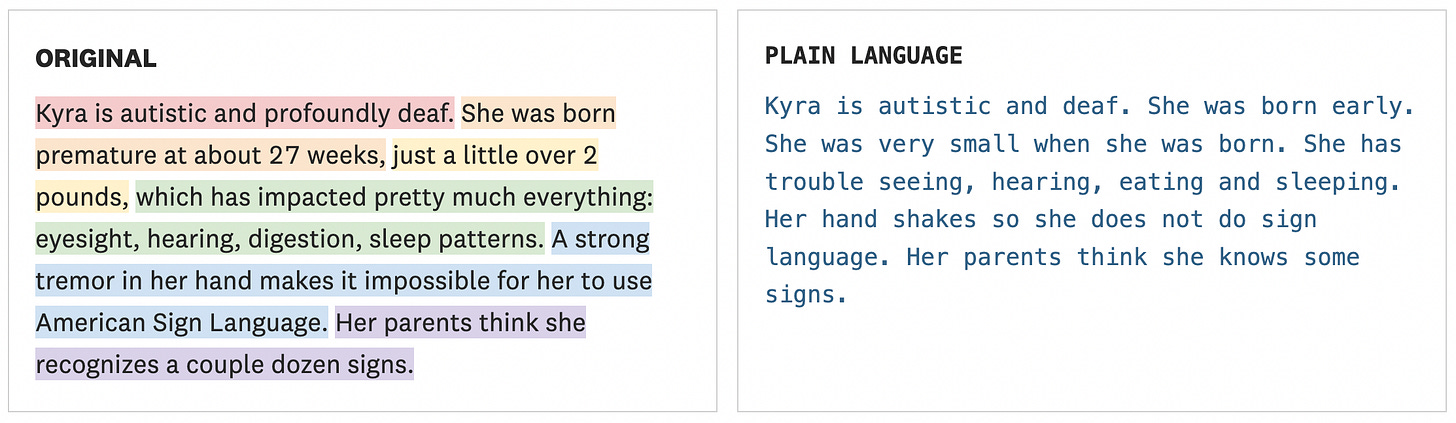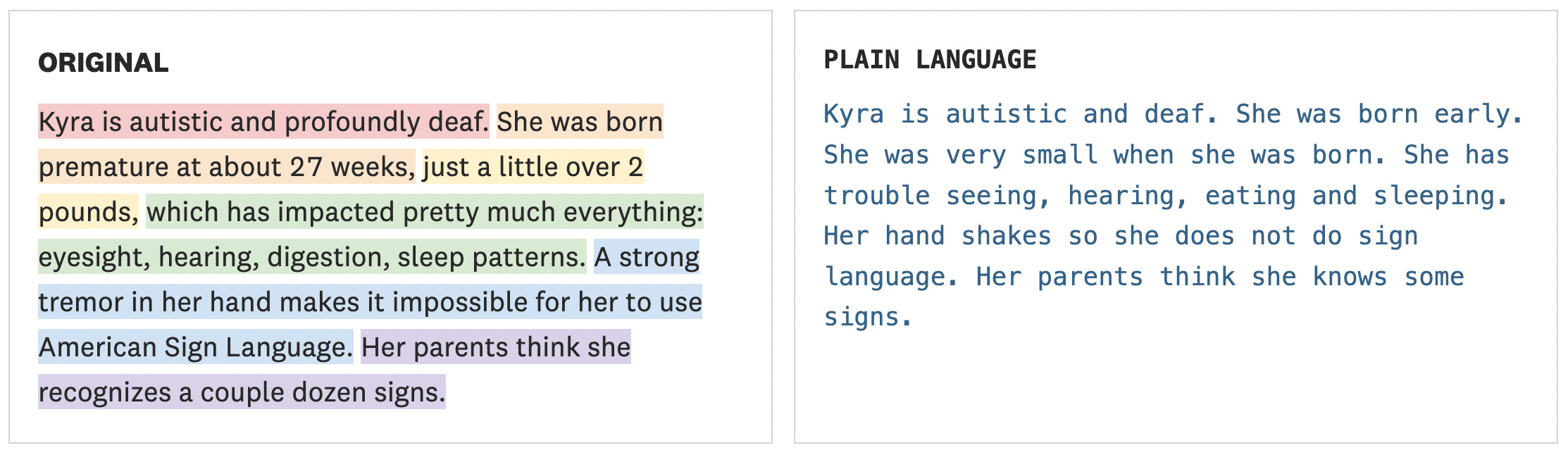 So it’s an attempt to explain what makes writing readable. To do so, the writers have built an essay that you can toggle between “normal” mode and “plain language” mode, and see the paragraphs side-by-side.