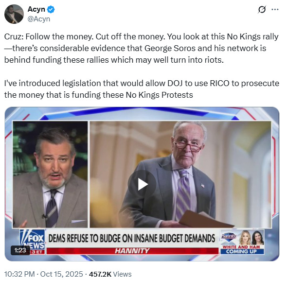 Re the Cheap Shot: I'll forward Ted "Cancun" Cruz the e-mails I've been getting from the No Kings organizers in Houston asking for donations to buy pallets of bottled water and port-a-potties. If there are billionaires secretly funding these protests, why didn't they pay for the water and port-a-potties, Ted?