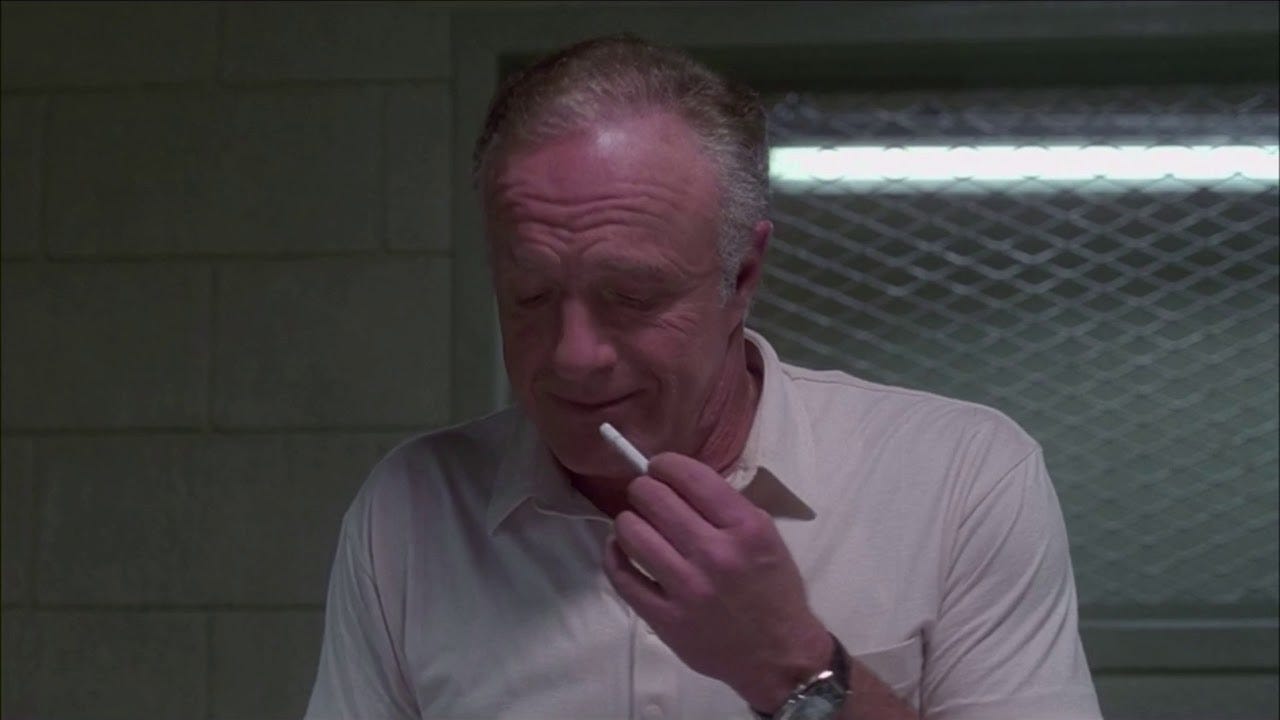 There’s something almost adolescent about Frank, as if he’s a grown man with those broad-ass shoulders stuffed into his silk shirts and $800 suits wielding teenage rebellion like a weapon. I’ve always adored the final moments of the picture, when he decides he’d literally rather blow up his life and burn down his own car lot than have to deal with the egos or stop being the boss of his own body. In that moment he’s Howard Roark, as adolescent a hero as has ever been made: pure, uncompromising, unable to go on with a life that he cannot control entirely.