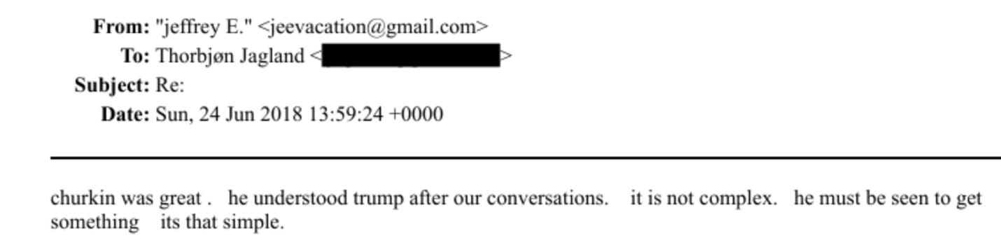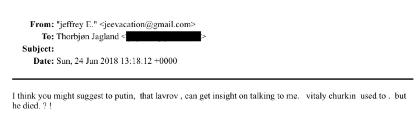 In his reply, Jagland promised to bring this up in a meeting with Lavrov’s assistant. Epstein responded with details about conversations he’d had with Vitaly Churkin, who had been Russia’s ambassador to the United Nations until his death the year before: