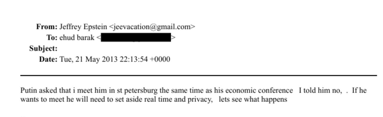 But as with much else in the Epstein story, the facts are often enmeshed with thinly sourced speculation. For instance, while the Daily Mail has some interesting information on Epstein’s Russian contacts, its headline contains the unsupported assertion that Epstein “had multiple talks with Putin after conviction.” But the article itself hedges this claim, saying only that Epstein “seems to have secured audiences with Putin” after his 2008 guilty plea (to two counts of solicitation, including solicitation of prostitution with a minor). A look at the relevant files shows that Epstein talked repeatedly about such meetings; but, as the independent Latvia-based Russian news site Meduza concludes, “There’s no evidence in the released files that a meeting between Putin and Epstein ever took place.” Notably, in May 2013, Epstein claimed to former Israeli prime minister Ehud Barak that he had turned down Putin’s invitation to meet: