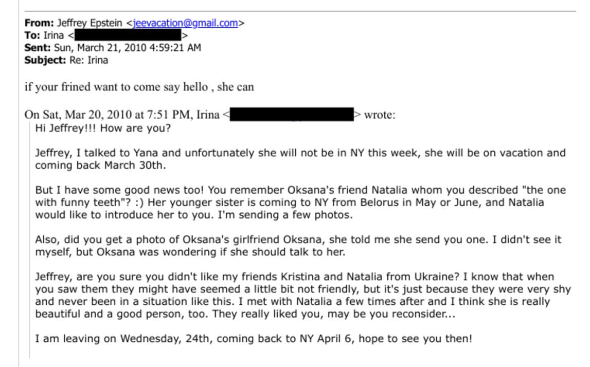 This relationship continued at least until 2018, when Epstein wrote to Spiridonova that he was “interviewing new assistants age 20-24” and she offered to help. “Find me three canditades [sic] and we can see,” Epstein wrote back.