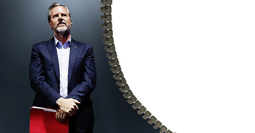 The Liberty community has always looked at Falwell and seen things that made us uncomfortable. He’s always shown us too much. For instance, Falwell has explicitly said that he takes no responsibility for the spiritual growth of Liberty students, even though the school is a Christian university. A loyal supporter of Donald Trump, Falwell has openly said that his political activities are not influenced at all by his faith. He called a Liberty parent—which is to say, someone who helps pay his salary—a “dummy.” He told one well-known evangelical pastor to “grow a pair,” and chided another for being unqualified to speak “on any subject.” Falwell even told Liberty students to “Render to Caesar the things that are Caesar’s,” then threw his support behind a bizarre plan for Virginia counties to secede from the state and join West Virginia.