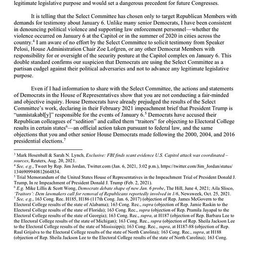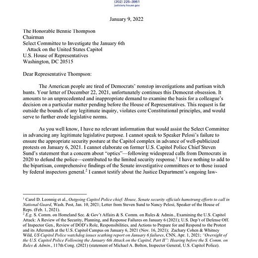 And so over the weekend, Jordan wrote the House committee investigating Jan. 6th that he would decline its invitation to testify voluntarily under oath.