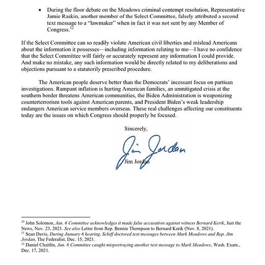 The Jan. 6th Committee may or may not subpoena Jordan and Perry and get their testimony. Given the mountains of documents and deposition testimony collected, however, failure to depose a few will not obstruct the search for truth. The same goes for the bevy of fake excuses that Jordan unloaded to cover his fear of testifying under oath.