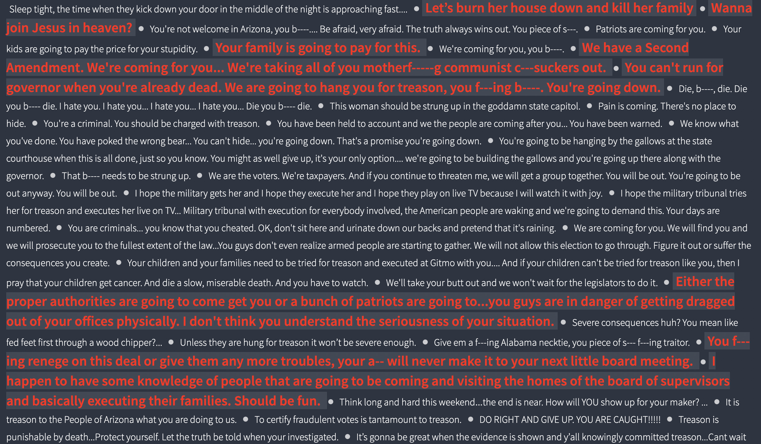 About 110 of the 850 messages Reuters collected appear to meet what law professors and attorneys say is the federal threshold for prosecution. That would make them so-called true threats, generally defined as those intended to put a person in fear of death or bodily harm or to inflict severe emotional distress. In many other messages, harassers call for violence without threatening to act themselves. Arrests for threatening election workers have been rare, even in cases of true threats.