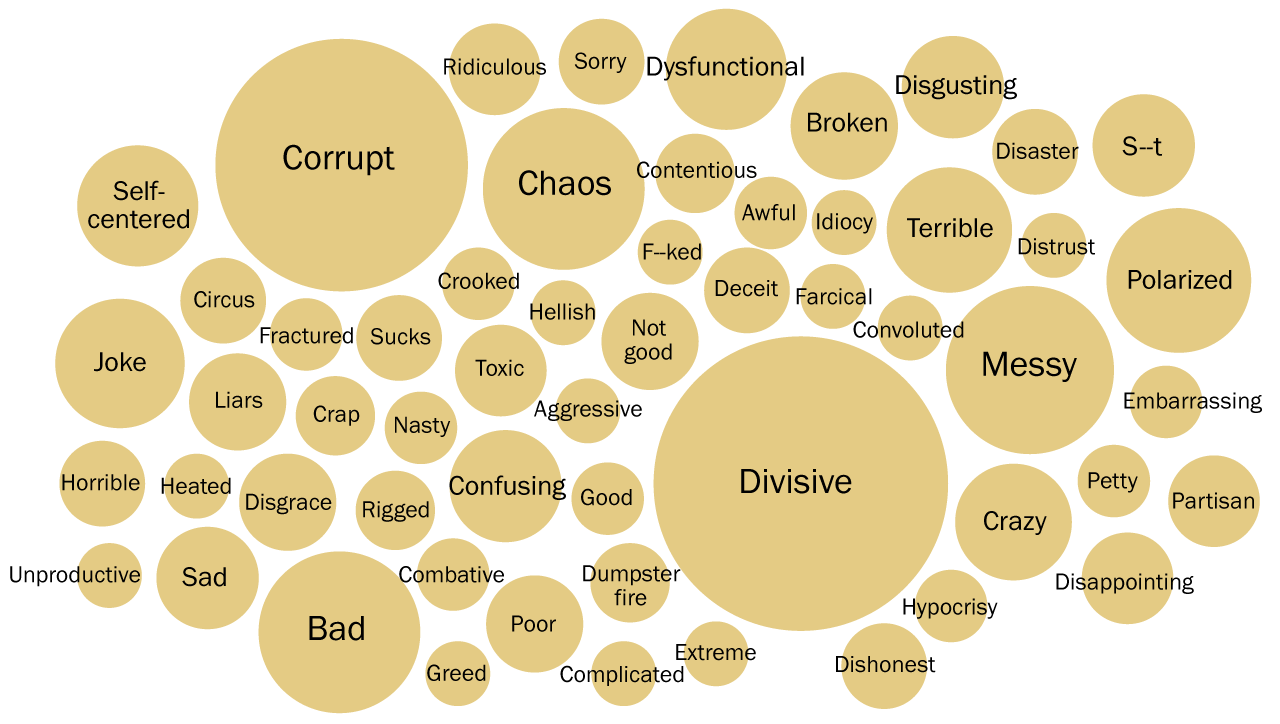 In an open-ended question, people were asked: “What one word or phrase would you use to describe politics in the U.S. these days?”