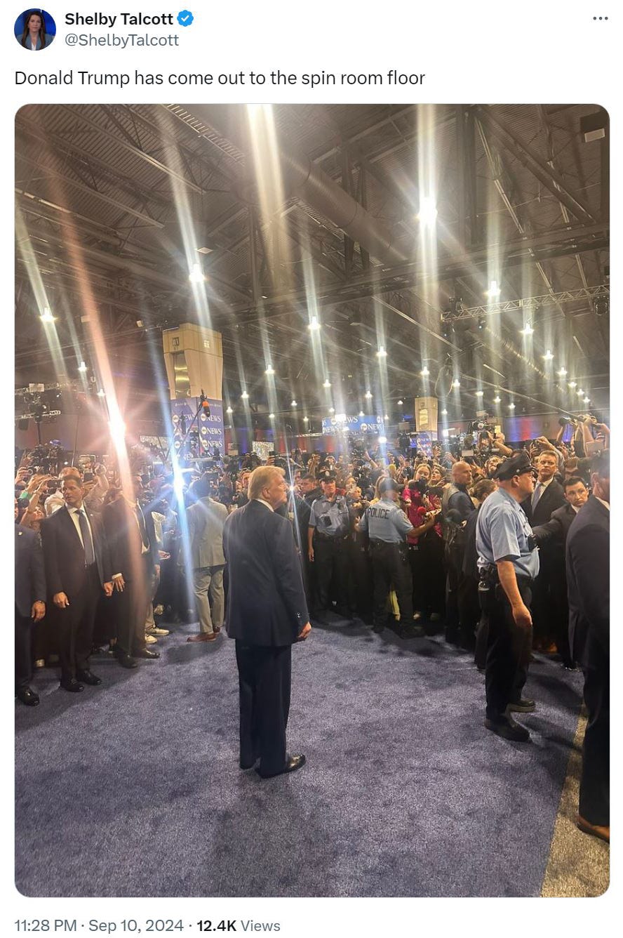 And it was driven fully home when the debate was over, the second-most-interesting visual of the night was produced. There was Trump, coming out into the spin room, the place where a candidate sends his or her deputies to work the press—since God knows that’s the purview of the plebs, not the person in charge.