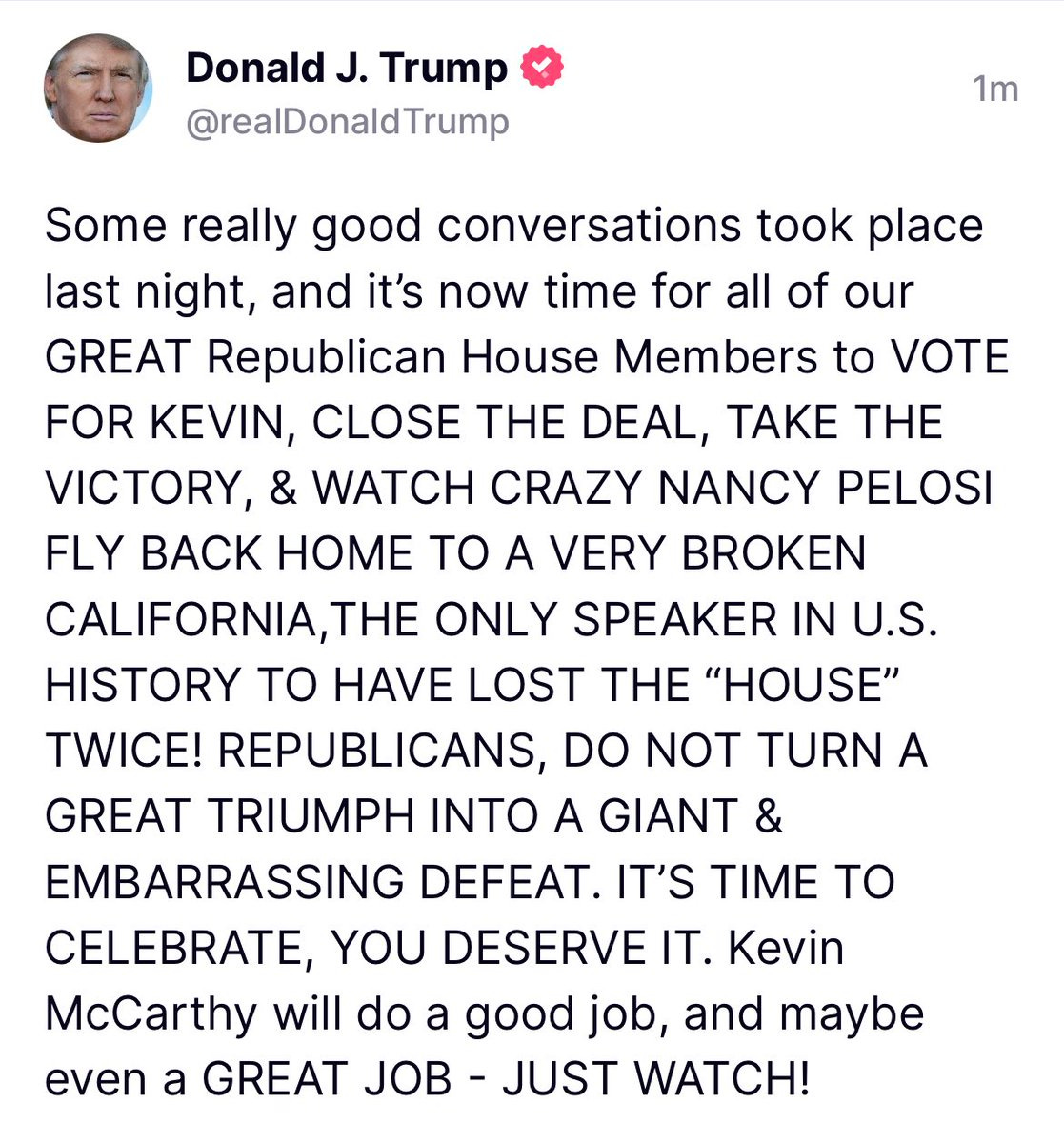Over at Puck, Tara Palmeri notes that “One of the cruel ironies of all this is that McCarthy, who went to extraordinary lengths to placate Trump, is being stymied by card-carrying members of his MAGA movement. And where is Trump in McCarthy’s hour of need?” This morning he issued a ALL CAPS endorsement.