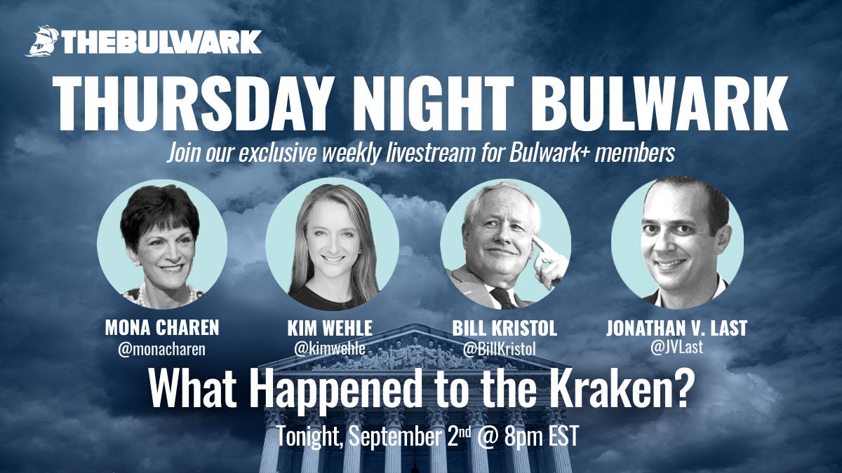 Bulwark+ TakesLIVESTREAM: What Happened to the Kraken?William Kristol, Mona Charen, and Jonathan V. LastSep 02, 2021∙ Paid1ShareBill Kristol, Mona Charen, and JVL are joined by Kim Wehle to check in on what has happened to Team Kraken so far—and how bad it’s going to get. Plus, Texas's abortion law and the Supreme court.This post is for paid subscribersJoinAlready a paid subscriber? Sign inPreviousNext