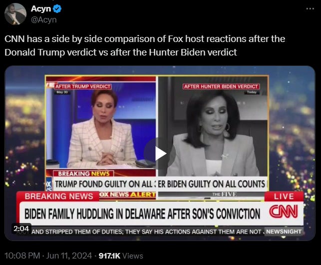 I think that what you’re seeing today and what we saw in New York in connection with the Trump criminal case is jurors doing their job . . . In both situations, jurors heard the facts, they weighed credibility, and they made decisions. And it didn’t matter if you’re dealing with the former president of the United States . . . or you’re dealing with the son of the president. These are jurors that did their duty and the rule of law held in both situations.